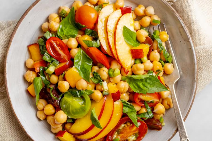 1. In a bowl, combine olive oil, basil, lemon juice, jalapeño, salt, and pepper. Add in chickpeas, tomatoes, and nectarines and toss to coat.